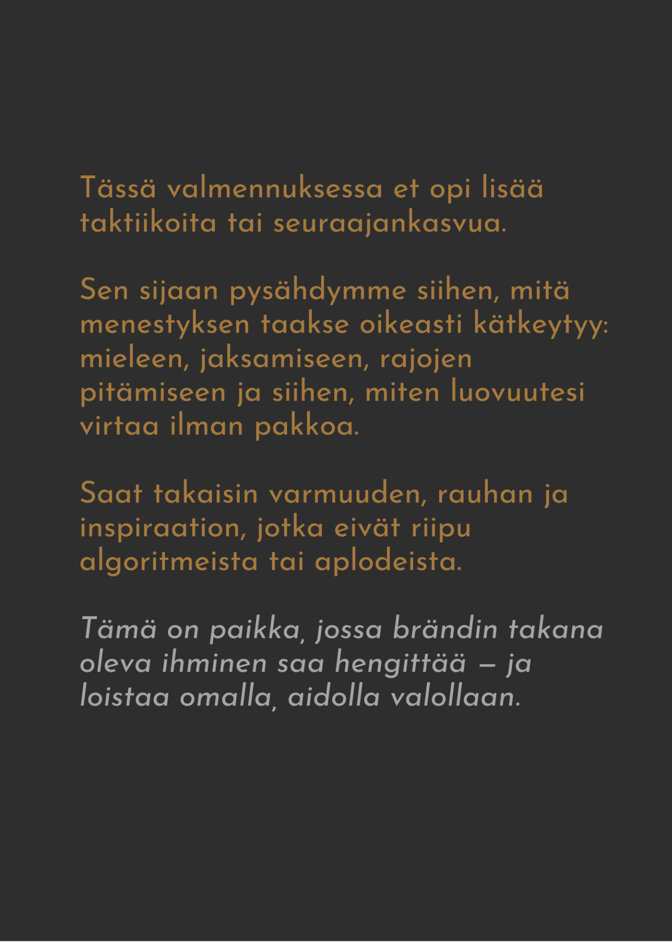 Samaan aikaan sisälläsi kasvaa hiljainen tunne: "Haluan löytää takaisin itseeni. Ilman jatkuvaa suorittamista."